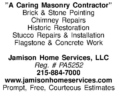 A Caring Masonry Contractor Brick & Stone Pointing Chimney Repairs Historic Restoration Stucco Repairs & Installation Flagstone & Concrete Work Jamison Home Services, LLC Reg. # PA5252 215-884-7000 www.jamisonhomeservices.com Prompt, Free, Courteous Estimates