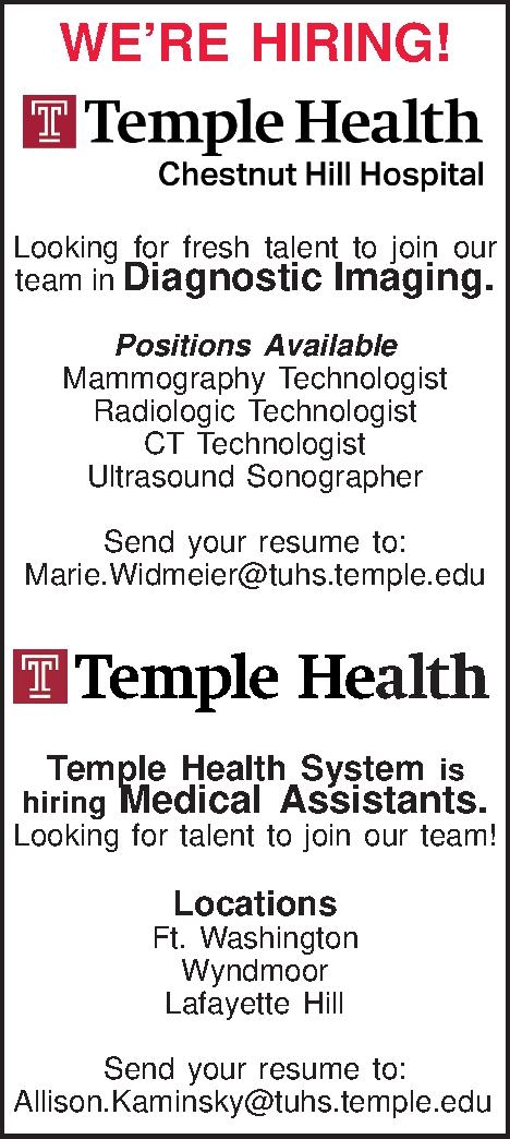 WERE HIRING! Looking for fresh talent to join our team in Diagnostic Imaging. Positions Available Mammography Technologist Radiologic Technologist CT Technologist Ultrasound Sonographer Send your resume to: Marie.Widmeier@tuhs.temple.edu Temple Health System is hiring Medical Assistants. Looking for talent to join our team! Locations Ft. Washington Wyndmoor Lafayette Hill Send your resume to: Allison.Kaminsky@tuhs.temple.edu