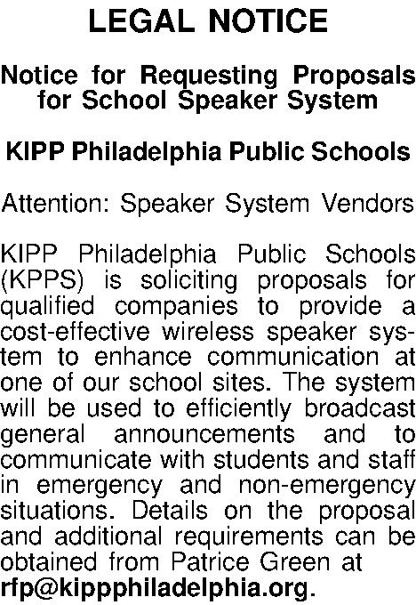 LEGAL NOTICE Notice for Requesting Proposals for School Speaker System KIPP Philadelphia Public Schools Attention: Speaker System Vendors KIPP Philadelphia Public Schools (KPPS) is soliciting proposals for qualified companies to provide a cost-effective wireless speaker system to enhance communication at one of our school sites. The system will be used to efficiently broadcast general announcements and to communicate with students and staff in emergency and non-emergency situations. Details on the proposal and additional requirements can be obtained from Patrice Green at rfp@kippphiladelphia.org.