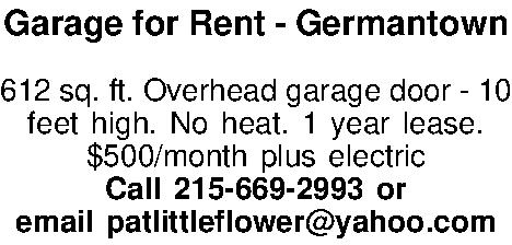 Garage for Rent - Germantown 612 sq. ft. Overhead garage door - 10 feet high. No heat. 1 year lease. $500/month plus electric Call 215-669-2993 or email patlittleflower@yahoo.com