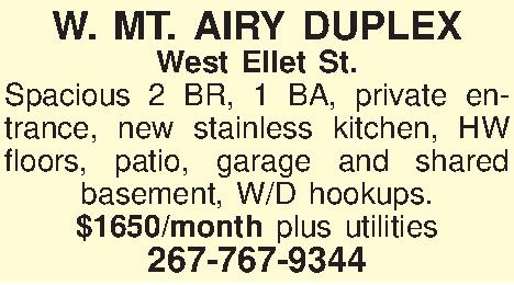 W. MT. AIRY DUPLEX West Ellet St. Spacious 2 BR, 1 BA, private entrance, new stainless kitchen, HW floors, patio, garage and shared basement, W/D hookups. $1650/month plus utilities 267-767-9344