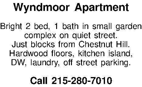 Wyndmoor Apartment Bright 2 bed, 1 bath in small garden complex on quiet street. Just blocks from Chestnut Hill. Hardwood floors, kitchen island, DW, laundry, off street parking. Call 215-280-7010