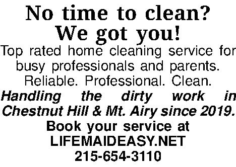 No time to clean? We got you! Top rated home cleaning service for busy professionals and parents. Reliable. Professional. Clean. Handling the dirty work in Chestnut Hill & Mt. Airy since 2019. Book your service at LIFEMAIDEASY.NET215-654-3110