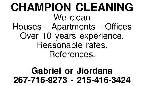 CHAMPION CLEANING We clean Houses - Apartments - Offices Over 10 years experience. Reasonable rates. References. Gabriel or Jiordana 267-716-9273 - 215-416-3424