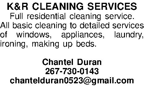 K&R CLEANING SERVICES Full residential cleaning service. All basic cleaning to detailed services of windows, appliances, laundry, ironing, making up beds. Chantel Duran 267-730-0143chantelduran0523@gmail.com